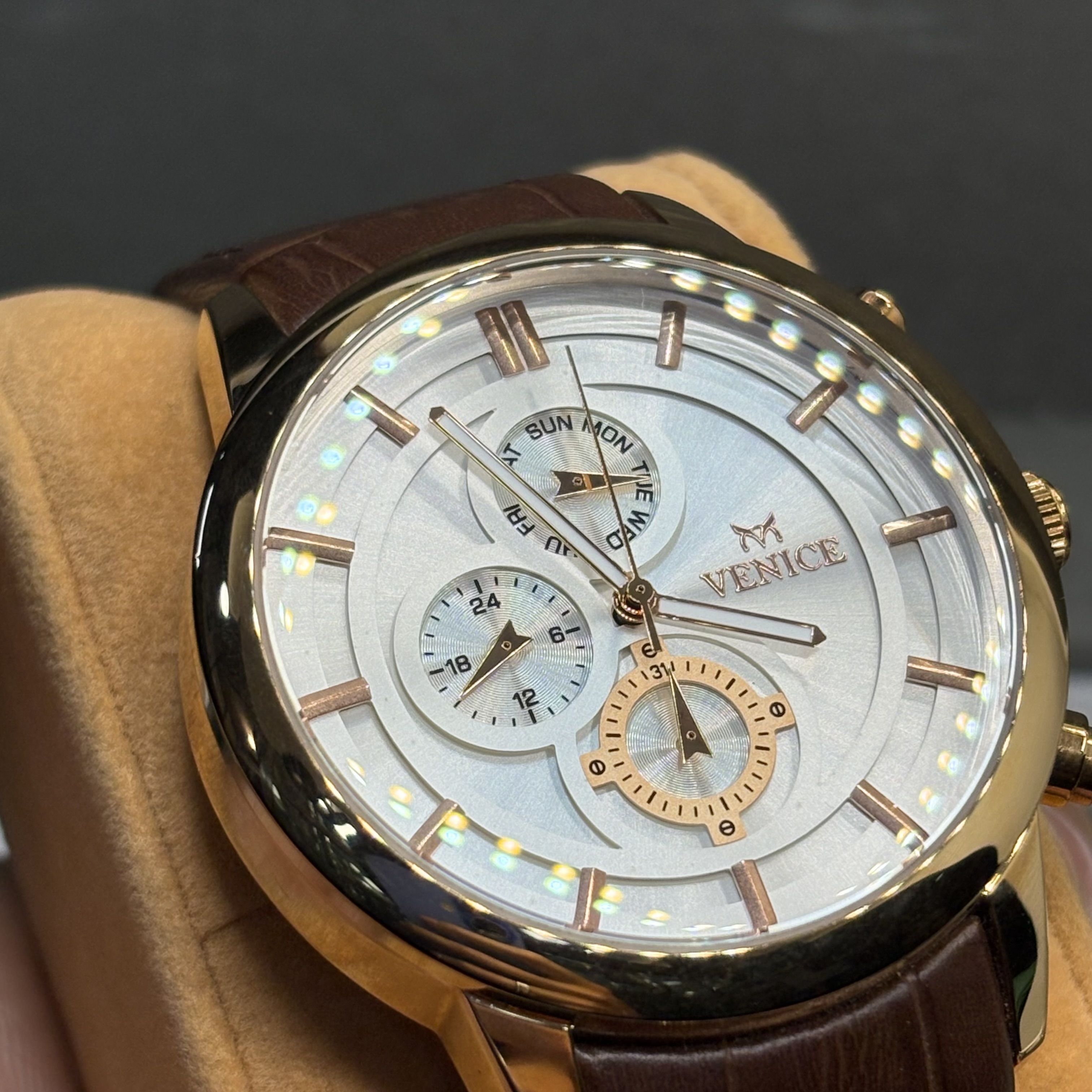ساعت V801092101 از برند ونیز، یک ساعت ست زنانه است که به شماره رفرانس V80109 شناخته میشود. این ساعت فول تایم با بند چرمی و قاب طلائی طراحی شده که همراه با رنگ بند ، جلوهای از هنر و شکوه ایتالیایی را به نمایش میگذارد. صفحه این ساعت با رنگ سفید، جذابیت خاصی به آن بخشیده و با دقت در جزئیات، ترکیبی از سنت و مدرنیته را ارائه میدهد.