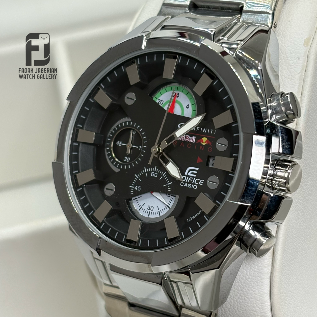 Casio edifice MOLDEL NO : EF535 مردانه ۳موتور فعال كرنومتر دار تقويم دار دسته کوک ساعت با حک لوگوی ادیفایس قفل كليپسي مارک کاسیو و ضامن دار شيشه معدني قطر صفحه : 49 MM