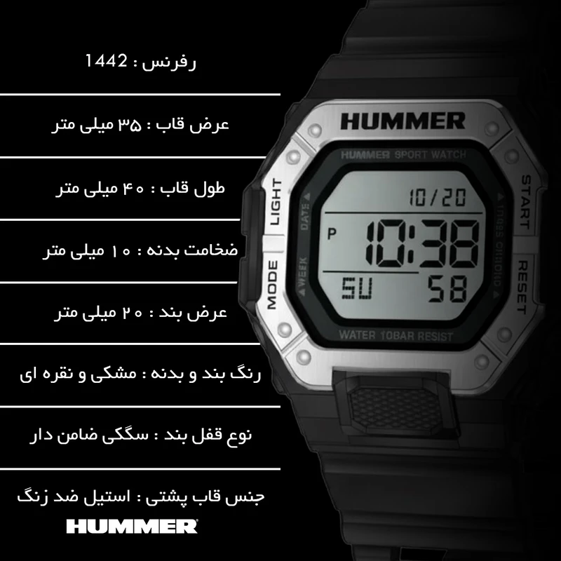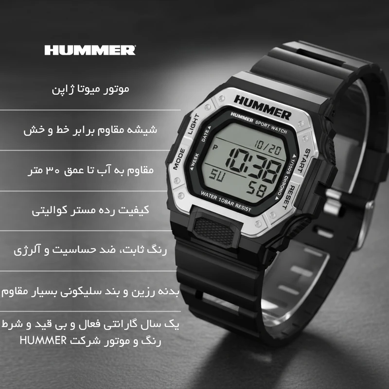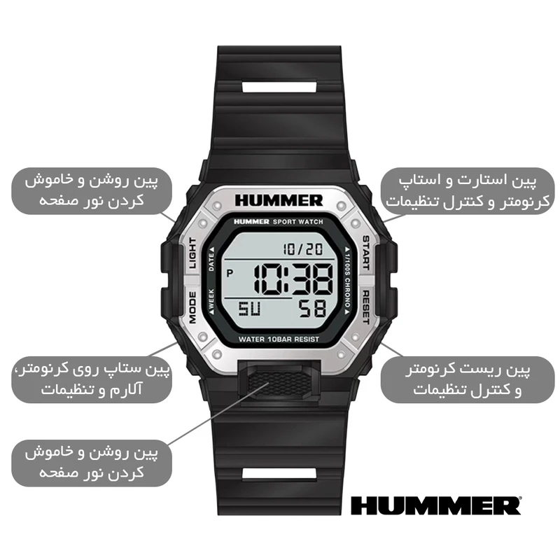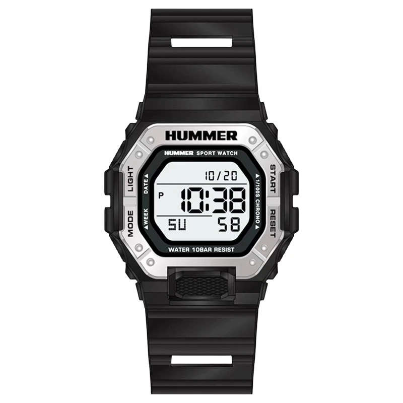 ساعت مچی مردانه هامر دیجیتال اورجینال با طراحی اسپرت و کاربری حرفهای، یک همراه کامل برای روزمره و فعالیتهای پرتحرک است. این ساعت مجهز به کرنومتر (استاپواچ) دقیق برای اندازهگیری زمان، چراغ پسزمینه برای مشاهده واضح در تاریکی، آلارم قابل تنظیم برای یادآوریهای روزانه، و نمایش تاریخ است تا همیشه از زمان و برنامههای خود باخبر باشید.
